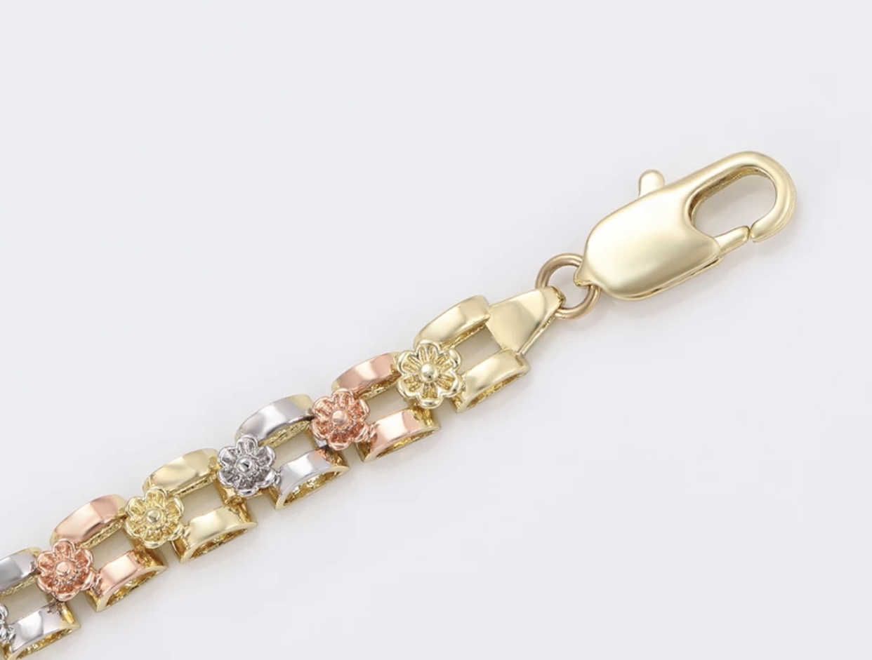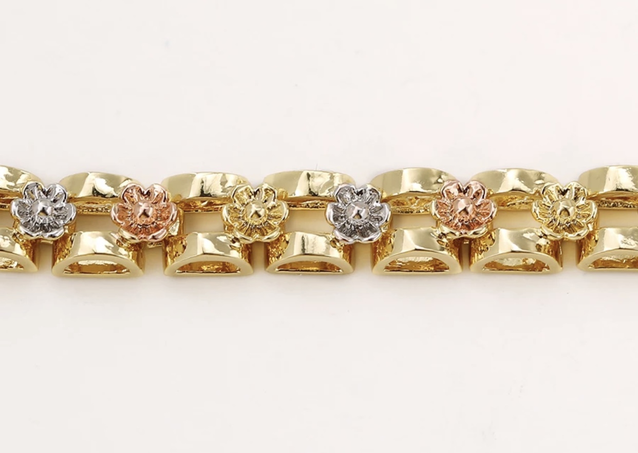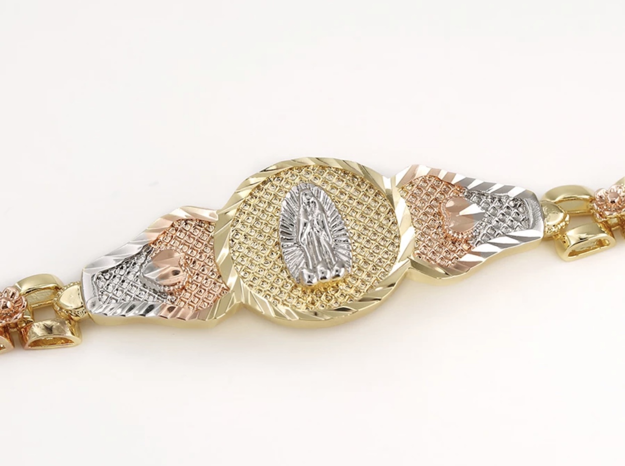 This stunning tri-color bracelet Jewelry features an intricate Virgin Mary centerpiece surrounded by beautifully detailed floral designs in gold, rose gold, and silver tones. The adjustable chain ensures a comfortable fit for any wrist size, making it a perfect accessory for daily wear or special occasions. Crafted with high-quality materials, this bracelet offers both durability and elegance, symbolizing faith and style in one
